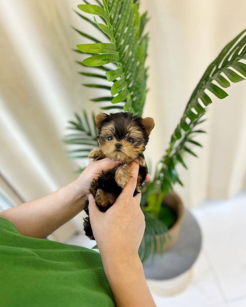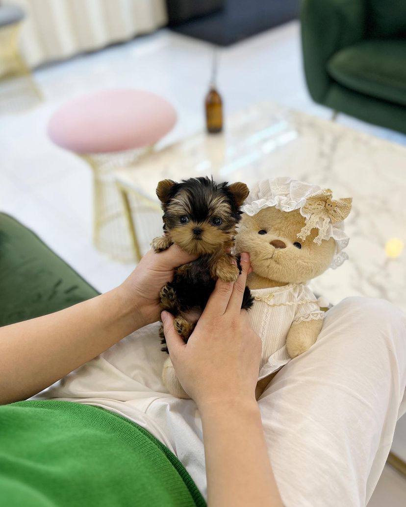 Lyra is an extremely cute micro teacup black Yorkie female with big eyes, a teddy bear look, a curly fluffy black coat, and a compact short body. Estimated to be only 2-2.5 lbs in adult size. His smart, friendly, cuddly personality will definitely melt your heart! She is super playful and affectionate; she is ready to fill your days with joy and laughter.