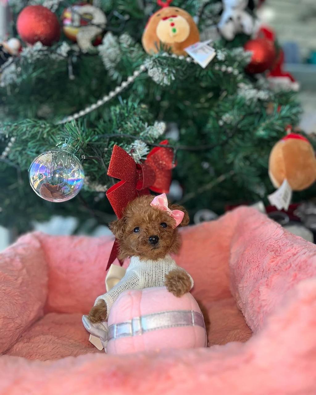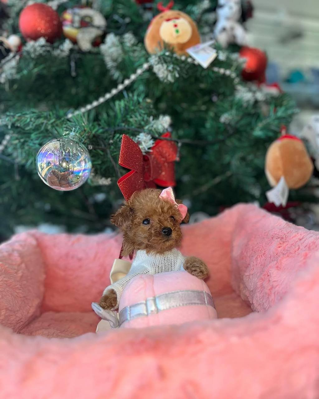 Sina is an extremely cute Teacup red poodle female with big eyes, teddy bear look, curly fluffy velvet red coat, and compact short body. Estimated to be only 2–3 lbs. in adult size. Her smart, friendly, cuddly personality will definitely melt your heart! She is super playful and affectionate; she is ready to fill your days with joy and laughter.